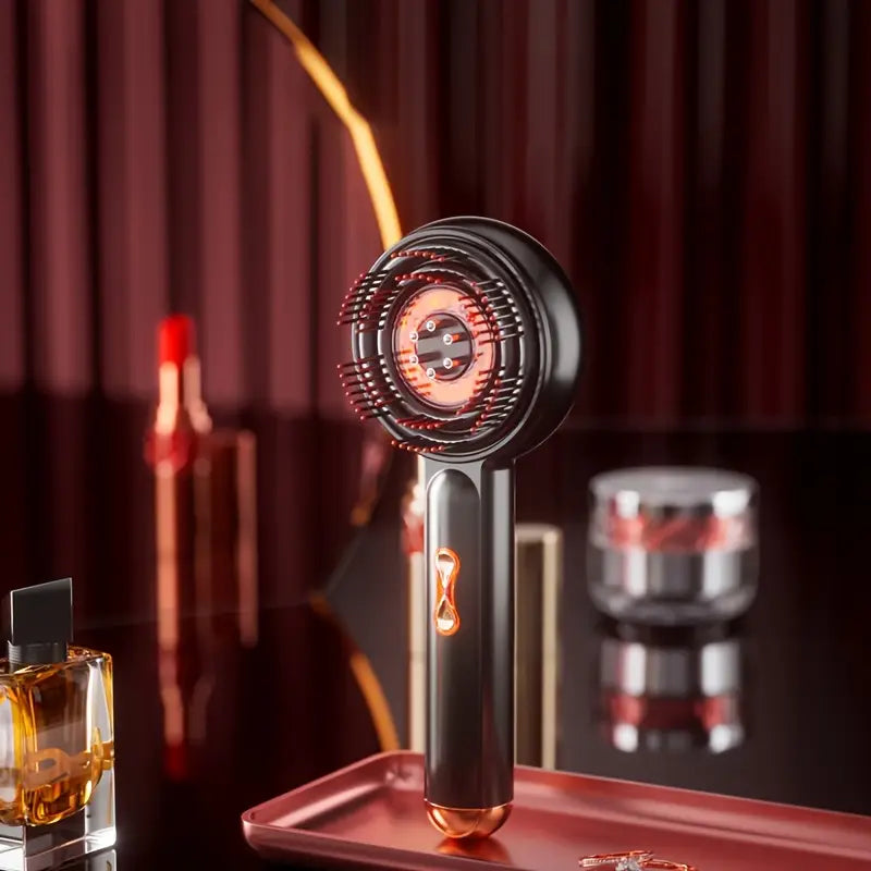 A portable, USB rechargeable scalp massager with vibrating comb functions that promote relaxation, improve hair care, and offer a lightweight, ergonomic design for cordless use and easy cleaning.